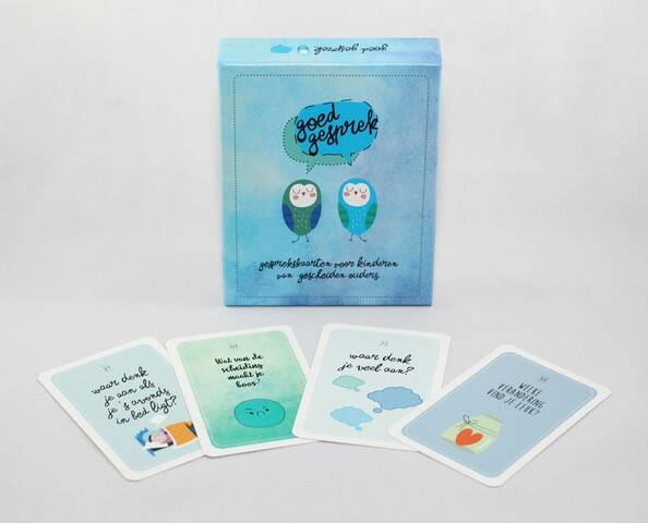 Het bevat vragenkaartjes die kinderen en ouders helpen op een ontspannen en speelse manier contact te hebben over de scheiding.